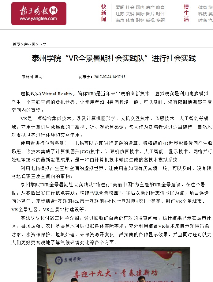 beats365官网“VR全景暑期社会实践队”将进行“美丽中国”为主题的VR全景建设,在这个暑假,从校园出发进行试点实践,构建“VR全景校园”。往后以泰州标志性地区为点,项目逐步向外延伸,逐步结合“互联网+城市”“互联网+社区”“互联网+农村”等等,制作VR全景城市、VR全景社区、VR全景农村建设等。