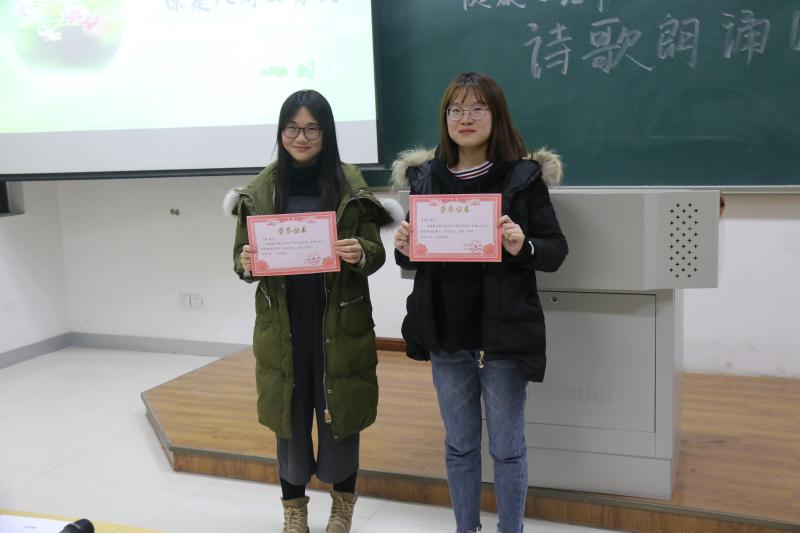 此次进入决赛的有12个人,以抽签的方式来决定他们的比赛顺序。首先上场的是袁绍飞、闫佳怡组合,一首《给战斗者》点燃全场气氛。接下来,黄辰同学的《青春的诗》、姜美美同学的《走西口》、王玉蓉同学的《当你老了》、吴建航同学的《江南,我愿做你怀中的一直清莲》和徐姝彤同学的《面朝大海,春暖花开》,配以悠扬缱绻的音乐,使现场观众感受到诗人的细腻情怀。许佳文同学的《致大海》、陈浩铨同学的《以梦为马》和冯金星同学的《沁园春·雪》,以饱满的激情让同学们心中久久不能平静。其中,经管公司的董耀同学特地来到现场,为我们带来了《将进酒》的精彩朗诵。本次比赛给观众印象最深的当属张硕萍同学朗诵的《少年中国说》,其以“巾帼不让须眉”的气概赢得本次比赛的冠军。