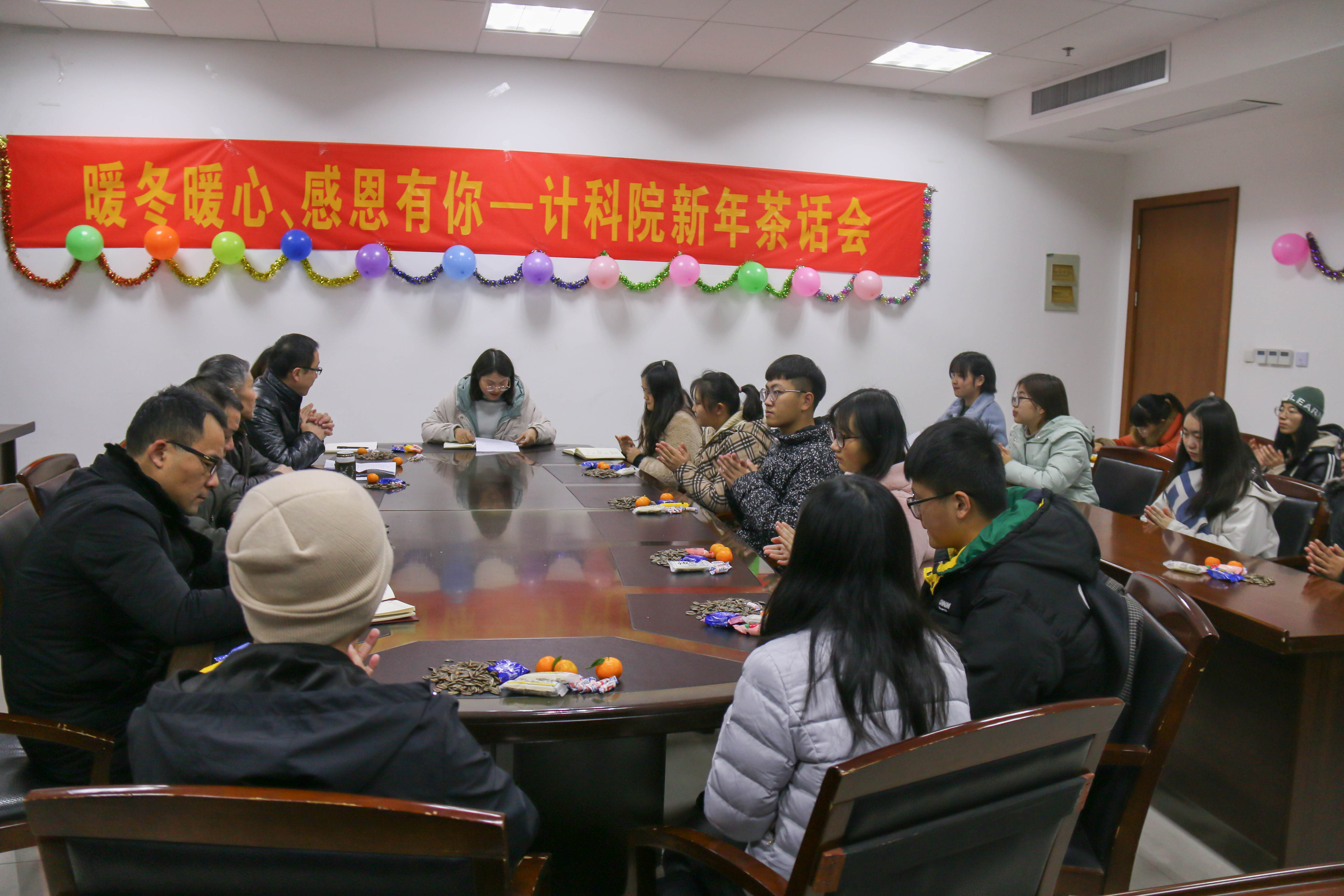1月3日下午,计算机科学与技术公司在行政楼D2307举行了“暖冬暖心,感恩有你”新年茶话会活动。参加本次茶会的有院关工委副主任邹跃老师、学工处副处长蒋成忠老师、校资助管理中心王硕老师、计科公司党总支书记董学森老师、计科公司党总支副书记、副经理陈茂国老师、计科院学工办老师以及部分学生代表。