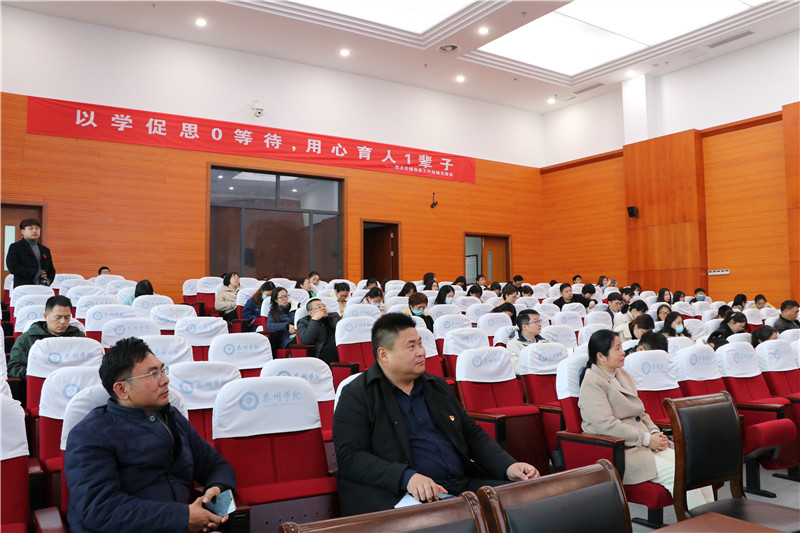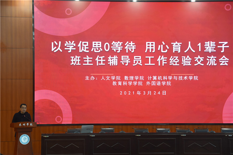 为落实立德树人根本任务,推进班主任辅导员队伍建设,切实提升班主任辅导员的专业素养和管理水平,3月24日下午,由人文公司、数理公司、计算机科学与技术公司、教育科学公司、外国语公司联合主办,“01”辅导员工作室承办的“以学促思‘0’等待,用心育人‘1’辈子”班主任辅导员工作经验交流会在D1216举行。校学工处、人文公司、数理公司、计算机科学与技术公司、教育科学公司、外国语公司的100多名班主任辅导员老师和“01”辅导员工作室所有成员参会。