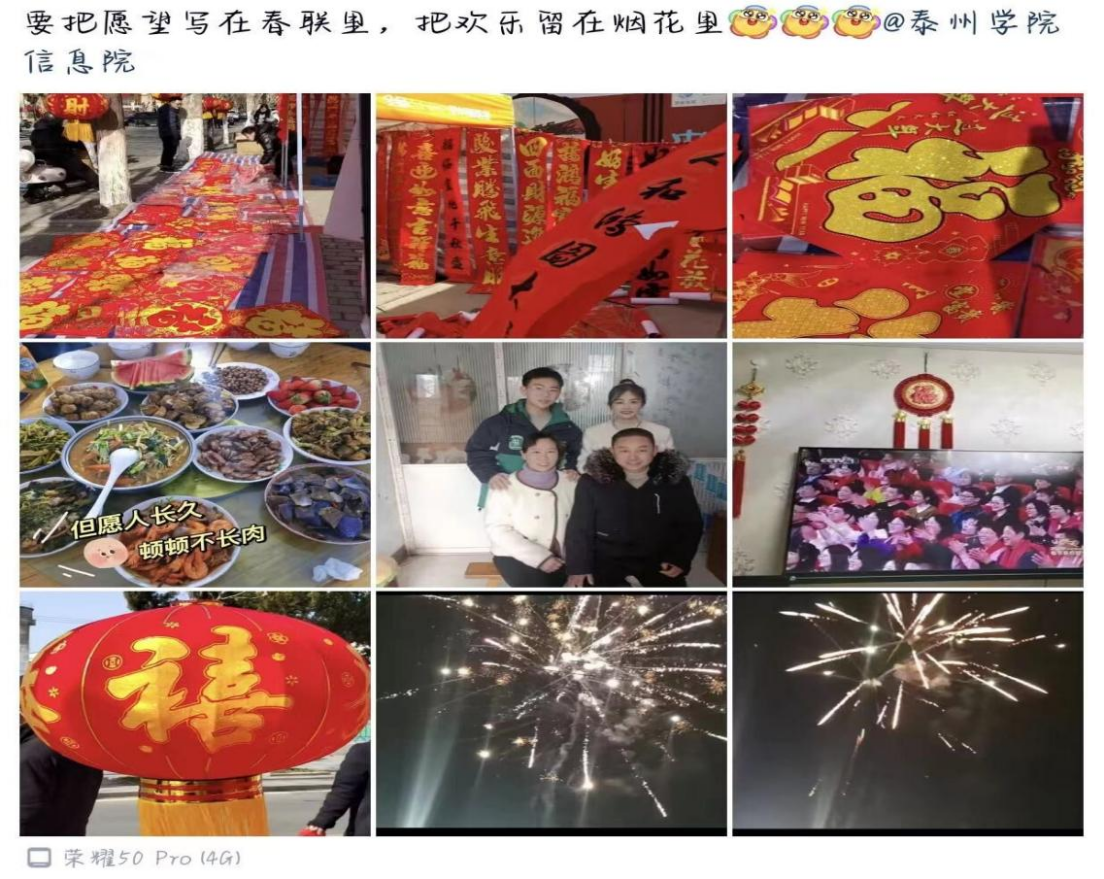 “年味回忆大赏”活动鼓励同学们放下手机,在节日里多多陪伴家人。买年货、扫尘、贴对联、吃年夜饭、守岁、拜年……同学们通过拍照打卡记录春节期间所参与的家乡春节风俗的点滴进行分享,重拾团聚的欢乐并寻回那份记忆中浓浓的年味。
