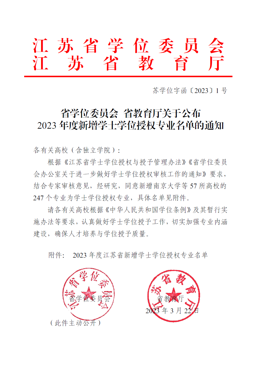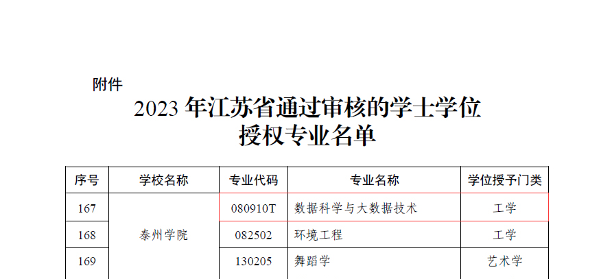 3月22日,江苏省学位委员会、江苏省教育厅发布《省学位委员会省教育厅关于公布2023年度新增学士学位授权专业名单的通知》(苏学位字函〔2023〕1 号),公司数据科学与大数据技术专业顺利通过学士学位授权审核,获得学士学位授予权。