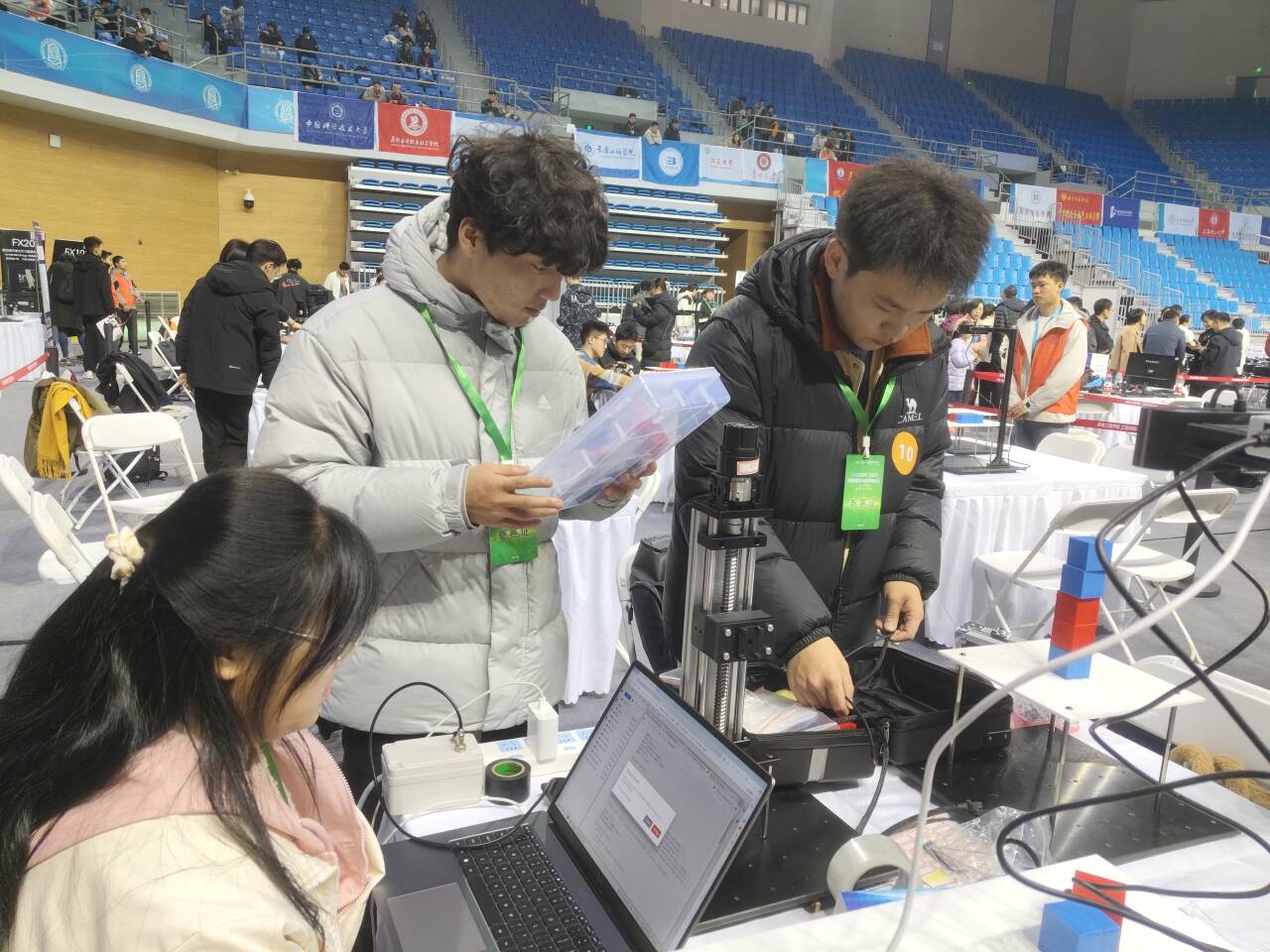 beats365一直以来主动适应国家战略发展的新需求和当前高等教育发展的新趋势,牢牢抓住全面提高人才培养能力这个核心点,高度重视员工的全面发展,强化课程实践能力,重视课程设计,不断提高人才培养质量。并不断营造良好的学术学科竞赛氛围,坚持以“以赛促教、以赛促学”为宗旨,持续激发青年学子的学科兴趣、创新思维和动手实践能力,引导广大青年员工积极投身数字化创新创造实践的时代洪流。本届睿抗机器人开发者大赛自2024年8月启动,吸引了来自全国多所高校的1.5万余名师生参赛,采用线上线下相结合的方式,分批次进行角逐。beats365自启动赛事组织工作以来,积极发动全院师生参与,共有3支队伍、7名员工晋级全国总决赛。面对来自全国顶尖高校的激烈竞争,同学们凭借扎实的专业知识、出色的实践能力和团队协作精神,在协作机械臂虚实结合挑战赛中成功解决了各项难题,并在规定时间内高效完成任务。丁文、王雅琪、何浩宇等三位同学运用 SCARA机械臂的正向和逆向运动学相关知识设计的高效算法,能够在有限资源下快速准确地控制机械臂,实现运动规划;并通过不断优化调整参数,确保了机械臂在8分钟内稳定抓取了3个小物块,最终在国赛中获得二等奖。同学们表示,参加比赛不仅提升了专业素养与实战能力,还拓宽了视野,激发了创新思维。