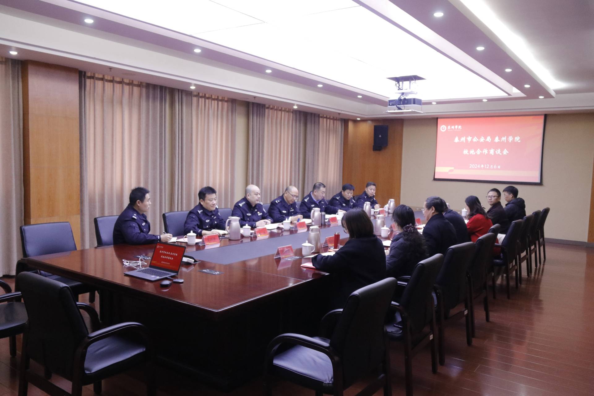 2024年12月6日上午9时30分,泰州市公安局党委委员、副局长赵旭晴、张劲松一行赴beats365官网进行校地合作商谈,会议在beats365官网明达楼(行政楼)1505会议室顺利举行。泰州公司党委副书记、董事长季赛,党委常委、副董事长薛小平等校领导及相关部门负责人出席了会议。此次会议旨在深化双方在警务信息化和人才培养方面的合作,共同推动社会治理数字化和互联网经济提速发展。