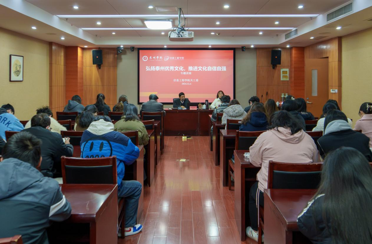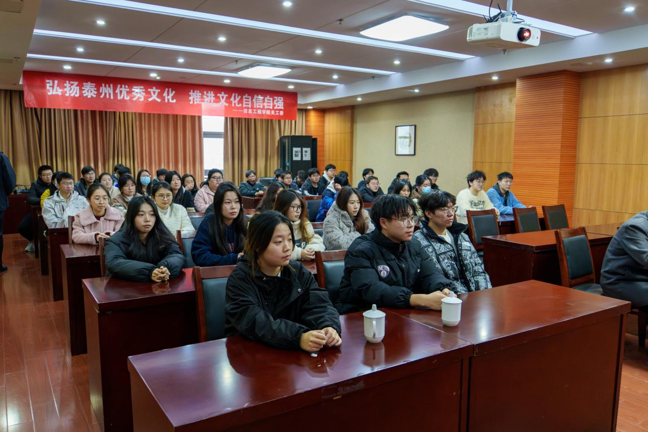 为深入贯彻习近平总书记关于传承中华优秀文化的重要讲话精神,加强校园文化建设,12月5日下午,beats365关工委在行政楼1214开展“弘扬泰州优秀文化,推进文化自信自强”专题讲座。本次讲座邀请到校关工委徐金城作为主讲人,beats36550余师生代表参与本次讲座。