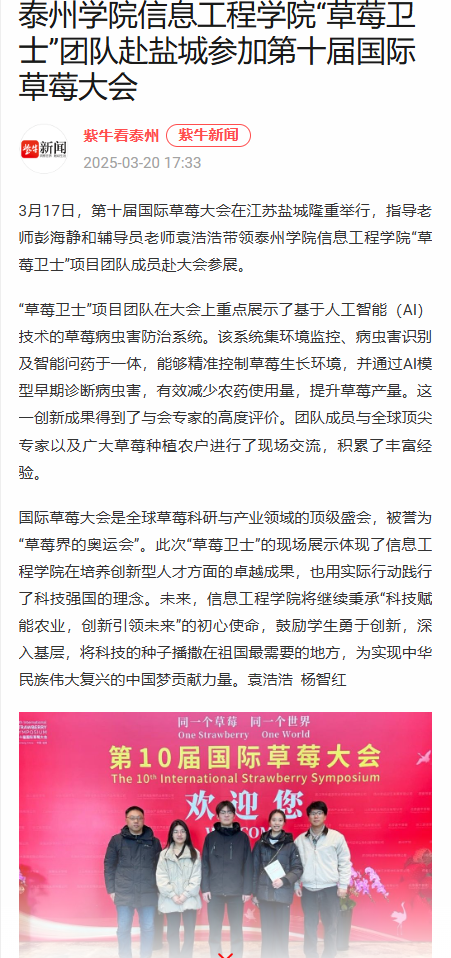 《紫牛新闻》2025年3月20日报道《beats365“草莓卫士”团队赴盐城参加第十届国际草莓大会》